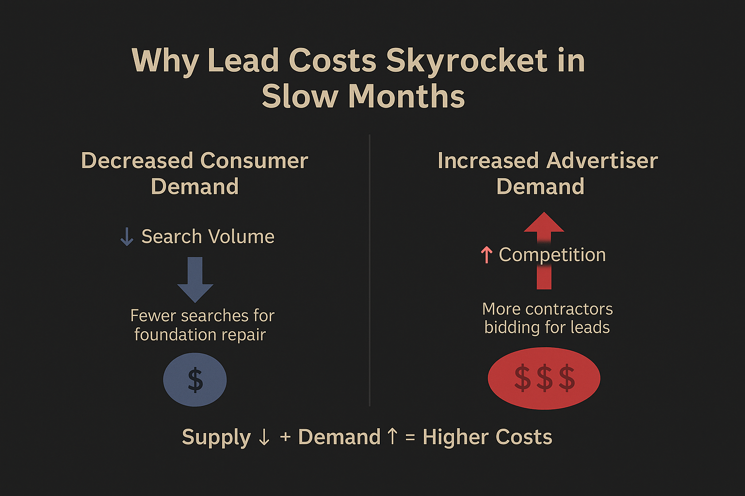 The graphic below illustrates the core challenge foundation repair contractors face during the slow season: while consumer demand (left side) drops significantly due to seasonal factors, advertiser competition (right side) rises as businesses attempt to maintain their lead flow. This imbalance leads to higher costs per click (CPC) and ultimately increases the cost per lead. Understanding this dynamic can help contractors adjust their marketing strategies and spending to avoid overspending during periods of reduced consumer interest.