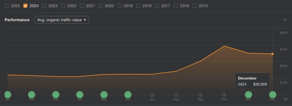 Ahrefs Organic Traffic Value: This metric estimates the cost of paying for the same traffic via Google Ads. For one client, the organic traffic value during the slow months reflected significant savings compared to the increased CPC of paid ads.